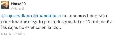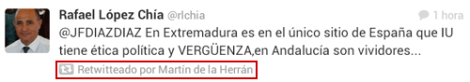 La historia comienza con el tweet de abajo, «retuiteado» por Martín: «En Extramadura es el único sitio de España que IU tiene ética política y VERGÜENZA, en Andalucía son vividores…«.