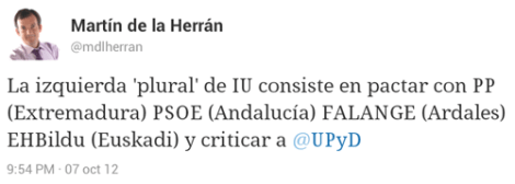 Y se podría puntualizar mucho este tweet… como que en Extremadura no se ha pactado con el PP, como que en Ardales no se ha pactado con Falange sino que Falange votó nuestra candidatura y no la del PSOE (Falange ya no tiene representación en Ardales) o como que en Euskadi no se ha pactado nada aún y, si se pactase, sería «si se deja en un segundo plano las aspiraciones independentistas y se antepone la salida de la crisis«. De ésto último no dicen nada…
