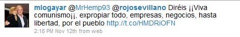 Por Twitter no se quedaba corto, cuando me dijo que yo estaba «abducido por el virus nacionalista» o que nosotros (Izquierda Unida) «creíamos en ETA» y que UPyD estaba «con los demócratas luchadores, con las víctimas, con la libertad y en guardia»: