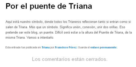 Pero parece ser que Curro ya ha actualizado de verdad, o lo ha hecho el ABC… no lo sabemos. Pero es todo un poeta, nos da la bienvenida con una metáfora inspirada en el Puente de Triana: unión, conexión, unir dos orillas… pero en un sólo sentido, ya que los comentarios están bloqueados.