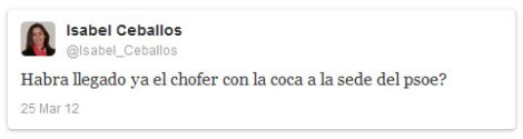 Para las elecciones andaluzas del pasado 25 de marzo, soltó una gracia que algo de polémica creó en Twitter. La mujer se preguntaba si el chófer con la coca había llegado ya a la sede del PSOE, que graciosa la mujer… comentario propio de una candidata a alcaldesa, sin duda.