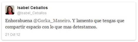 Y en las últimas elecciones vascas felicitaba así a su candidato, lamentando que tuviera que compartir espacio con «lo que más detestamos». ¿A quién detestan? ¿A los que se presentan a unas elecciones democráticas o al resto de la humanidad?