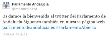 Hoy el Presidente del Parlamento Andaluz, Manuel Gracia (PSOE), ha presentado la puesta en marcha de los perfiles en Redes Sociales de la Cámara andaluza. La nueva cuenta de Twitter @ParlamentoAnd se estrenaba así: