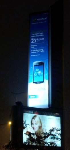 Si caminan por la ciudad, dejen por un momento de mirar las losetas rotas del suelo, y levanten la mirada al cielo hacia alguna farola (fernandina o no), podrán ver publicidad de Movistar.