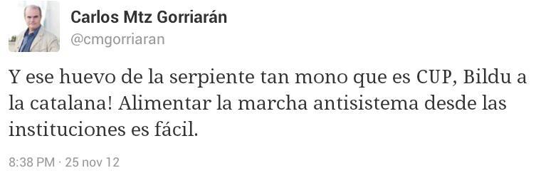 CUP: sust. Gorriarán. Siglas de Candidatura d’Unitat Popular. Organización política asamblearia, de izquierdas y huevo mono de la serpiente heredera de Bildu. [?]