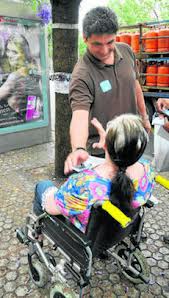 Cortés le da la mano a una mujer en silla de ruedas, en campaña
