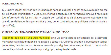 Seguimos analizando la web (municipal) adjudicada al ABC por 230.100 euros. En la pasada Junta Municipal de Triana, Curro Pérez afirmaba que sevillaciudad.ABCDESEVILLA.es no era una web municipal, sino un portal para la divulgación de la actividad municipal adjudicada por concusrso… así se recoge en el acta que abajo mostramos.