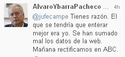 Pero no queda aquí la cosa… el mísmiso director de ABC de Sevilla, el Ilustrísimo y Máster en Bloqueo en Twitter, Don Álvaro Ybarra Pacheco también reconoce el error: