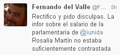 Sé que no es bueno mofarse de los profesionales pero, sinceramente, dudo de la profesionalidad de estos «periodistas»… así que publico un último tweet del director de ABC de Sevilla pidiendo disculpas al periodista (y gran amigo) del grupo parlamentario de Izquierda Unida. Voy a imprimirlo y a enmarcarlo para recordar la pequeña «victoria» de hoy: