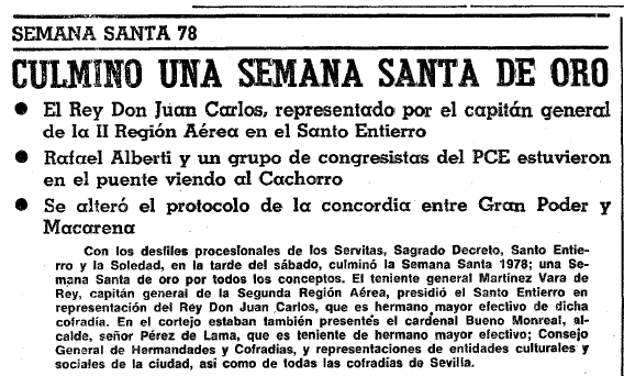 Corría la Semana Santa de 1978 y se celebraba en Sevilla la I Conferencia Regional del Partido Comunista en Andalucía, Rafael Alberti pronunciaba estos versos sobre la Macarena y también sobre el Baratillo o el Cachorro… al día siguiente, poco ha cambiado la línea periodística del periódico, el ABC se tiraba de los pelos.