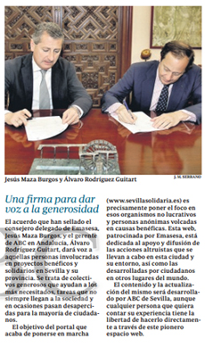 Hace unos meses leíamos en la edición de papel de ABC un nuevo acuerdo con el diario, esta vez desde la empresa municipal EMASESA. «Una firma para dar voz a la generosidad», así titulaba el sello de este acuerdo entre el consejero delegado de la empresa municipal y el gerente de ABC en Andalucía. Se trataba de poner en marcha una web sobre noticias de solidaridad para «el apoyo y difusión de las acciones altruistas que se llevan a cabo en esta ciudad».